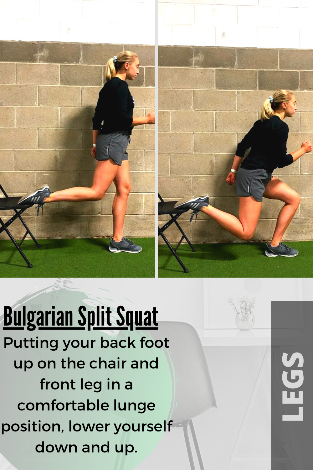 - One of the toughest leg exercises to me personally! This exercise forces you to incorporate every lower body muscle you have to help you out of the bottom of the split squat position. Having your foot elevated on your chair just adds to the difficulty.