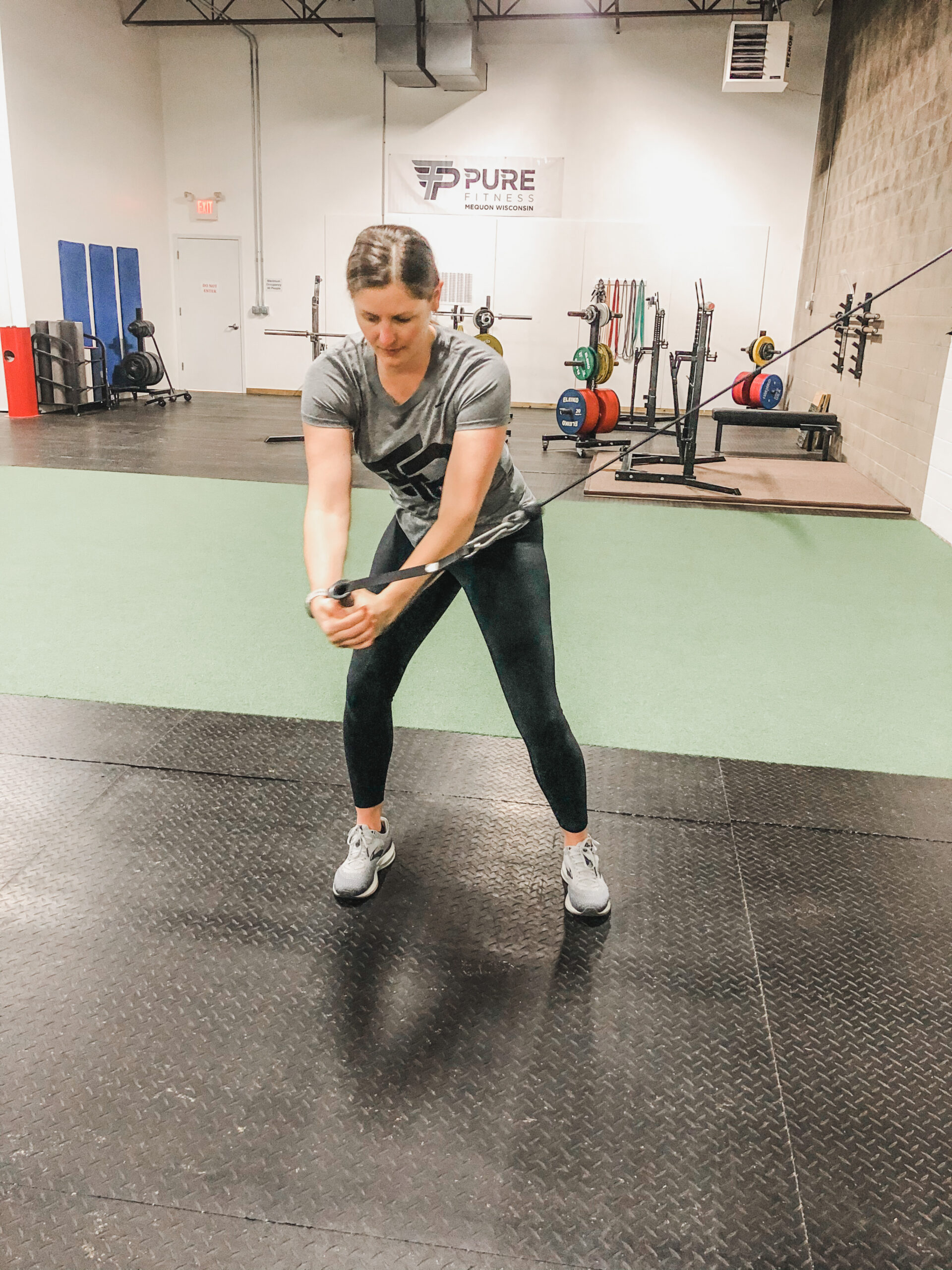 Our training philosophy starts with establishing range of motion (ROM), building stability within ROM and then building strength and power. We follow this philosophy with all of our clients and for all joints. We use band walks to build and maintain stability at the hips.