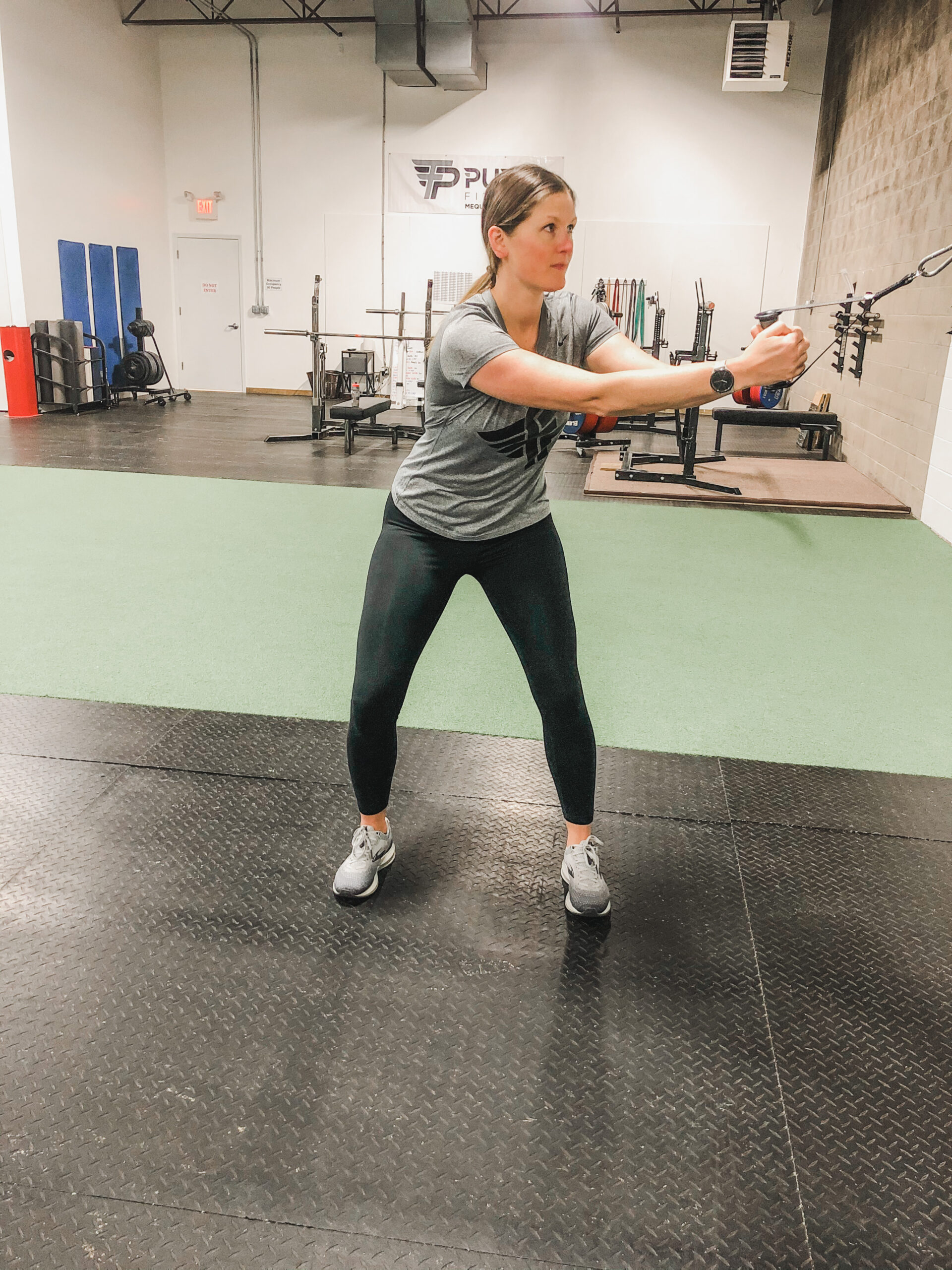 - Start perpendicular to and offset from the cable machine so that the machine is slightly in front of you. You can start on facing either side, as long as the cable machine is slightly in front of you.