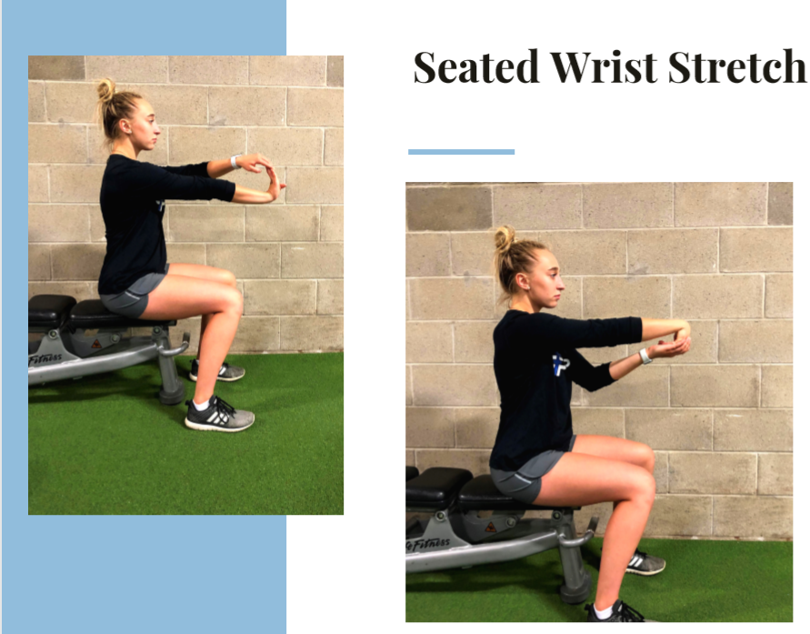 This stretch seems really simple, but can open up this joint that is so active in desk work. By pulling our fingers toward our chest, both above and below our wrist we can stretch our wrist and forearms. Doing wrist circles can also help this release. 30 seconds each side, each way // 2 minutes total