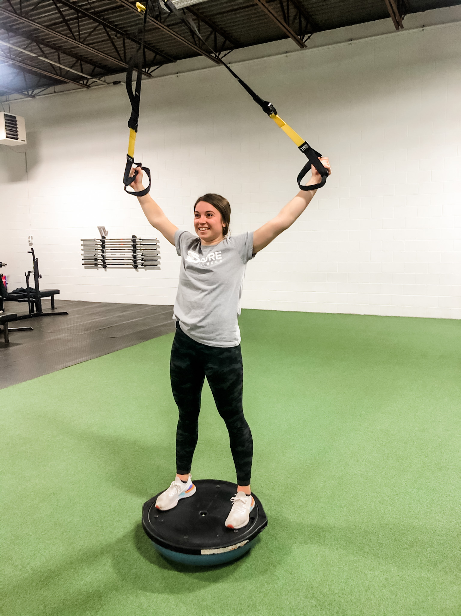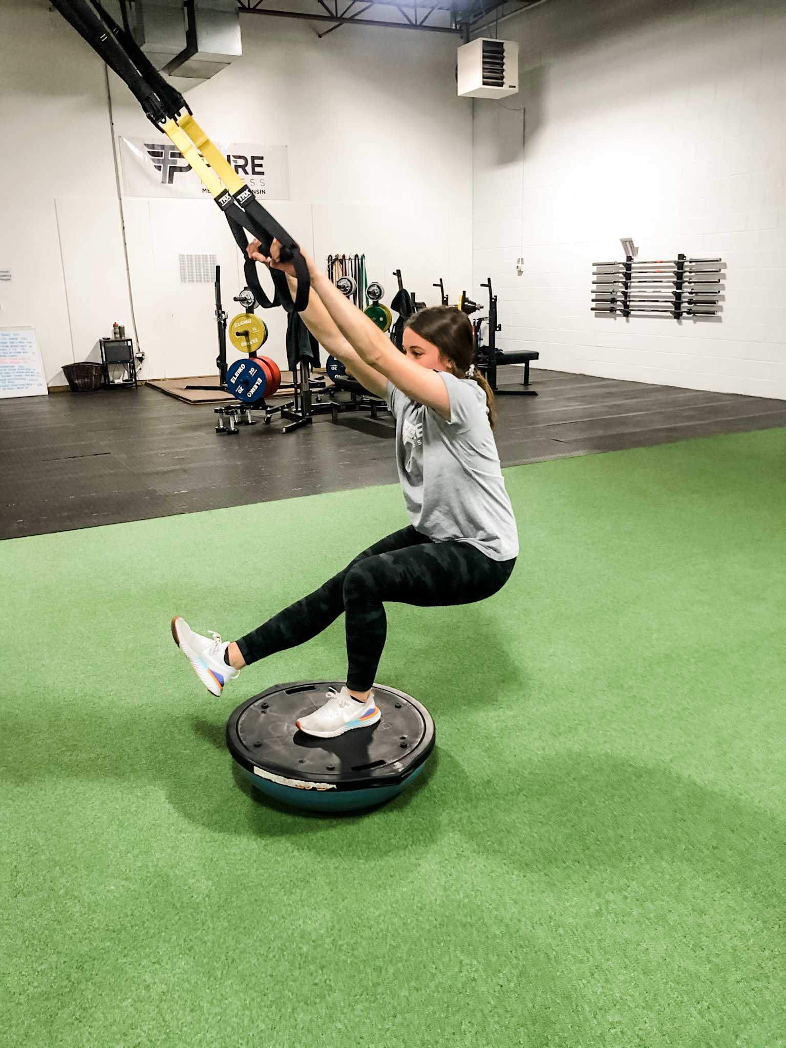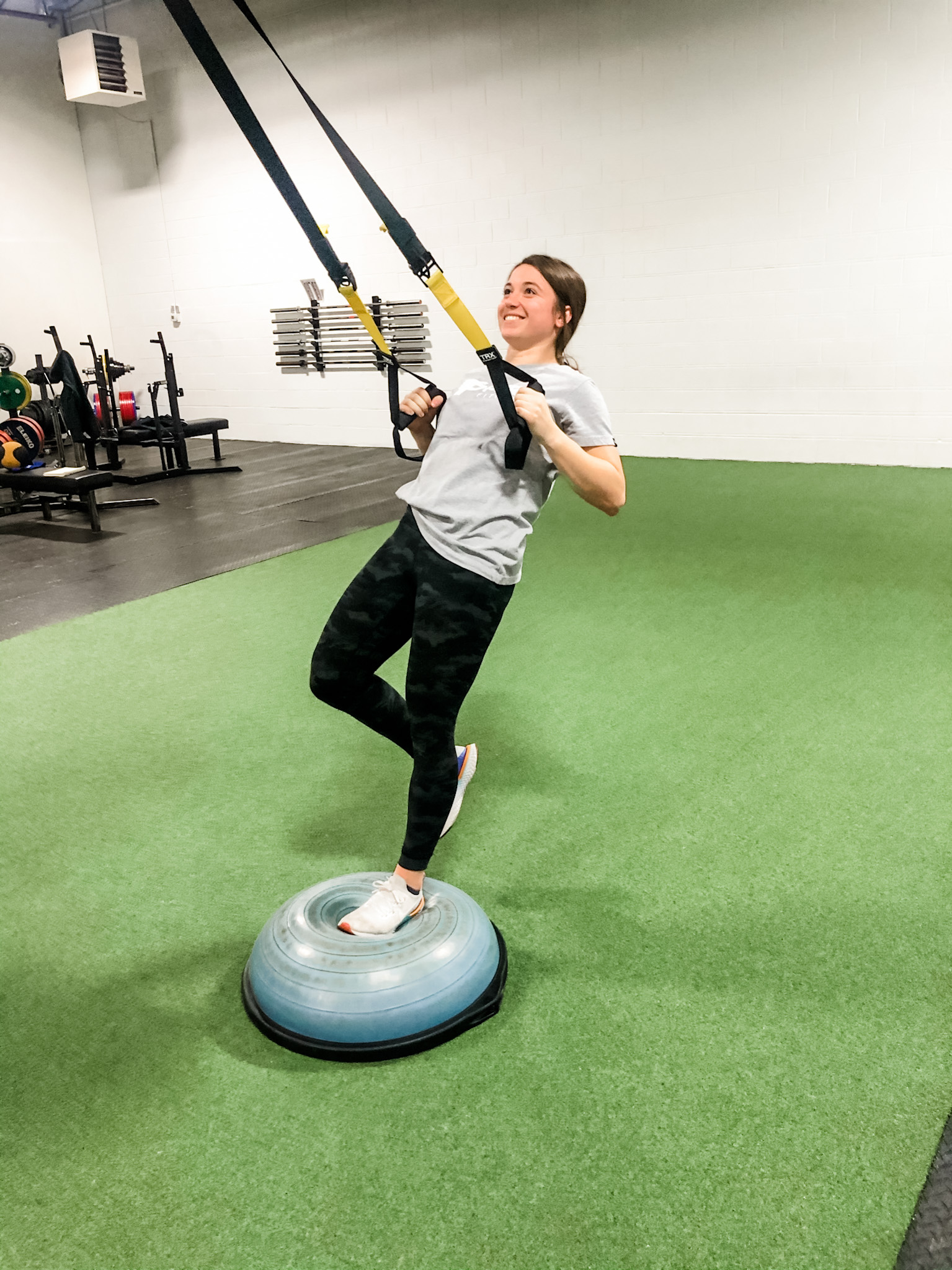 Between the BOSU Ball and the TRX you are getting a ton of core stimulation. The instability from the BOSU Ball requires full body tension, but most importantly core tension. Your core is just as important in TRX exercises. In a TRX chest press, you need to keep your core engaged to hold the plank position. If you do not engage your core your back will arch causing low back pain and making the chest press more difficult.