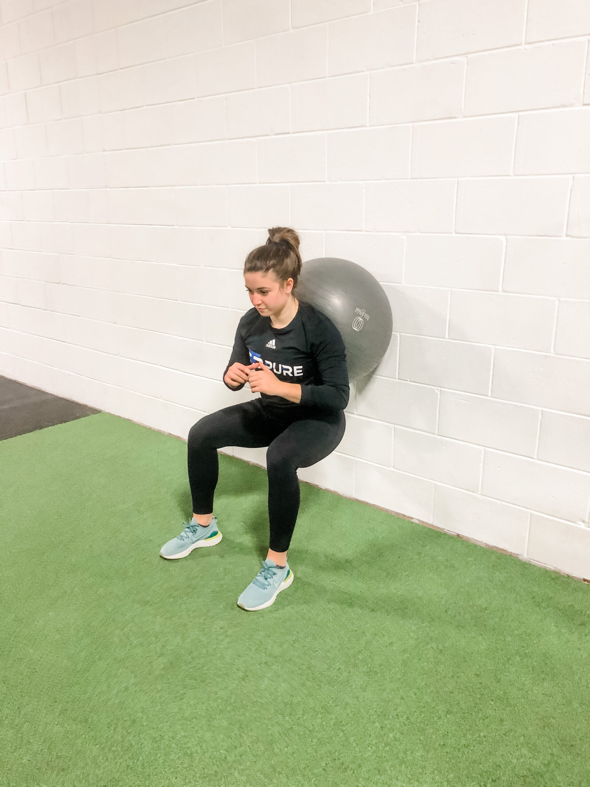 - When using the Swiss Ball against the wall in a squat or lunge position, the Swiss Ball should be positioned somewhere between the middle of your back and low back. If the Swiss Ball is to high it is likely your torso will curve forward, if the Swiss Ball is too low, you won’t be able to drive your hips back properly.