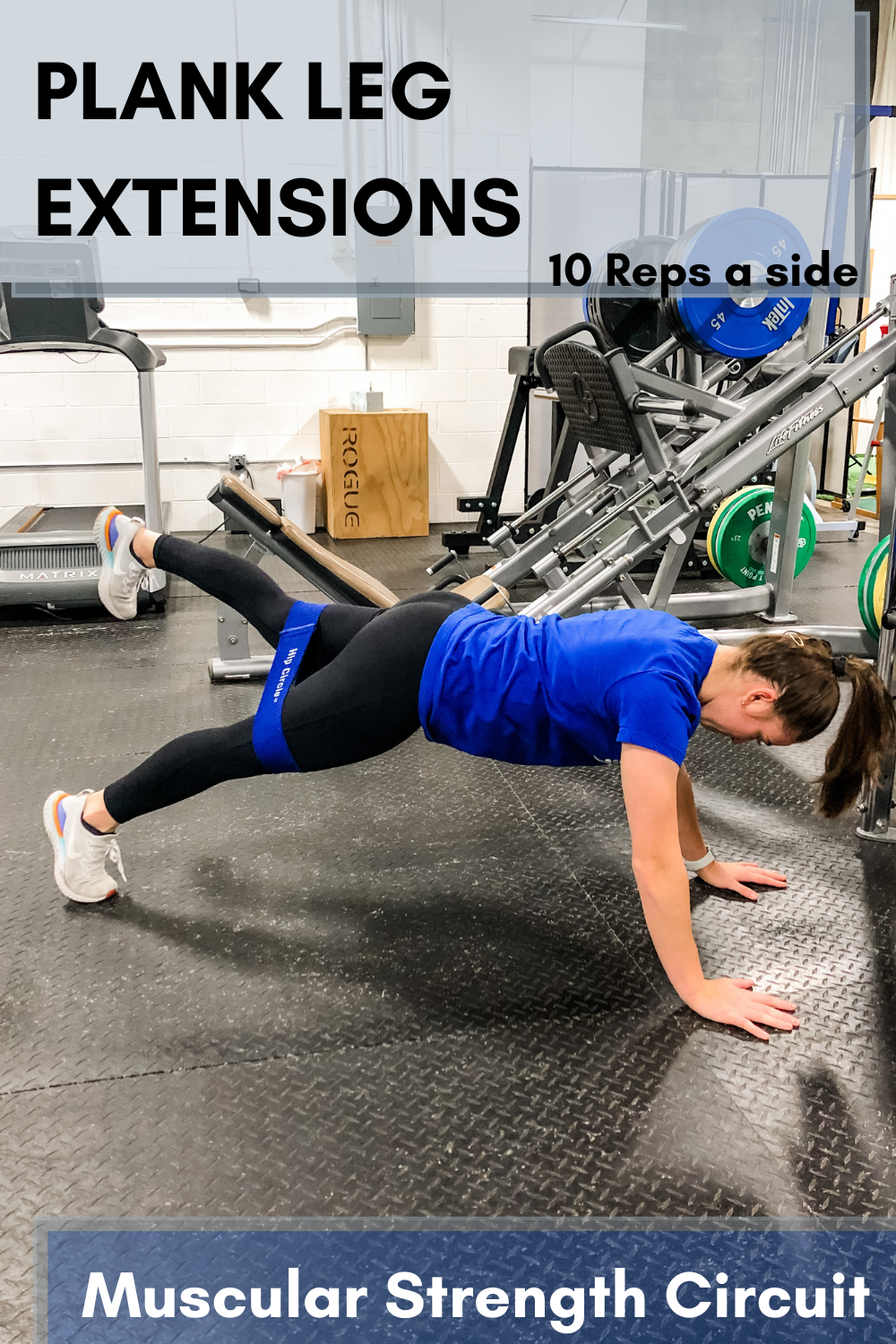 This is a circuit of 6 exercises and you will go through 3 times for a 20 to 30 minute workout. Your rest periods will be about 90 seconds in order to stay in the muscular strength window. You will want to weight these exercises a bit heavier because the rep count is lower! Shop dumbbells and a hip circle for leg extensions.